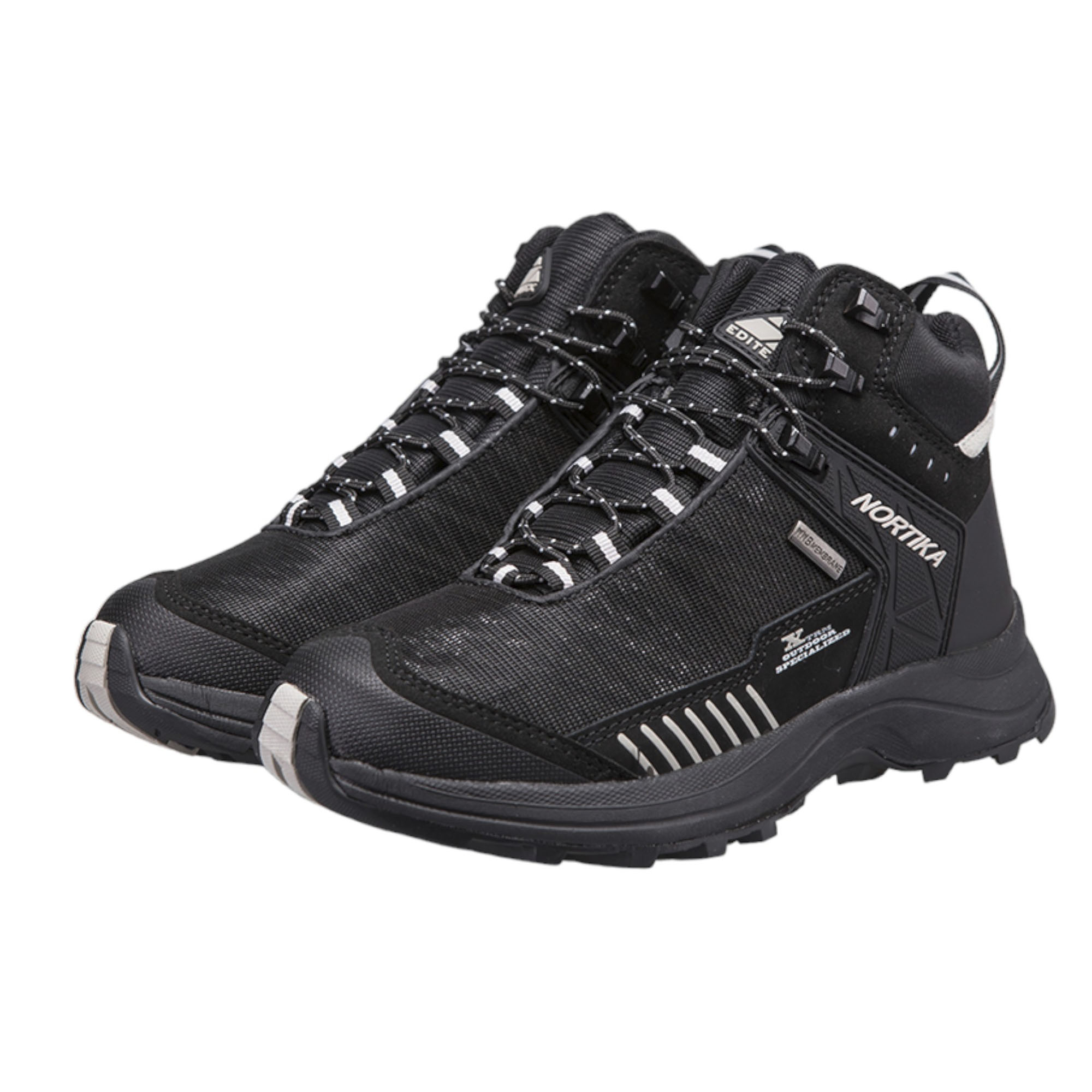 Современная компоновка и качественные материалы делают ботинки Editex Nortika отличным выбором для пеших походов, а тёмный дизайн позволяет носить их на городских улицах. Верхний слой ботинок состоит из комбинации текстиля и нубука, обеспечивая высокие износостойкие характеристики, что в сочетании с водоотталкивающей пропиткой защитит ноги владельца от промокания. Мембрана, выполненная по технологии Waterproof Windproof Breathable (WWB), наделяет ботинки не только влагозащитными свойствами, но и обеспечивает высокие ветрозащитные характеристики, ослабляя поток ветра за счёт микроскопических пор, а за счёт воздухопроницаемости ботинки сохраняют комфортный микроклимат внутри. Изделие оборудовано усилением носка и пятки, тем самым защищая ноги владельца от ударов об неровности. Специальная стелька OrthoLite сохранит комфортные условия для ног за счёт антимикробной пропитки, что позволяет предотвратить образование неприятного запаха и обеспечит вентиляцию стопы ног. Ботинки создают эффективное распределение нагрузки при ходьбе за счёт подошвы Ultra Slip Protection (USP), а развитый рисунок протектора создаёт максимальное сцепление с поверхностью со сложным рельефом. Специальные светоотражающие вставки позволяют быть заметным в тёмное время суток. Надёжную посадку на ноге обеспечивается за счёт качественной шнуровки на крепких петлях, позволяя ботинкам надёжно держаться в самых сложных условиях. Использование современных материалов позволило создать обувь для самых разных условий, обеспечивая высокую степень износостойкости, в результате чего сохраняя свою форму и цвет после длительного ношения. Утилитарный чёрный дизайн с использованием белых вставок позволяют носить ботинки как во время походов, так и в городе, отлично сочетаясь с различными элементами одежды.Характеристики: