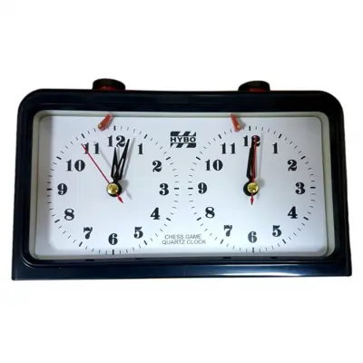 Часы шахматные кварцевые НВ9004.Шахматные часы используются для контроля времени во время игры. Часы включают в себя – два циферблата, две пластиковые кнопки для переключения часов, два пластиковых листа, предотвращающих случайное нажатие и включение часов . На каждом циферблате имеется флажок для фиксации окончания времени. С оборотной стороны находятся два поворотных механизма перевода стрелок для регулировки часовой и минутной стрелки.